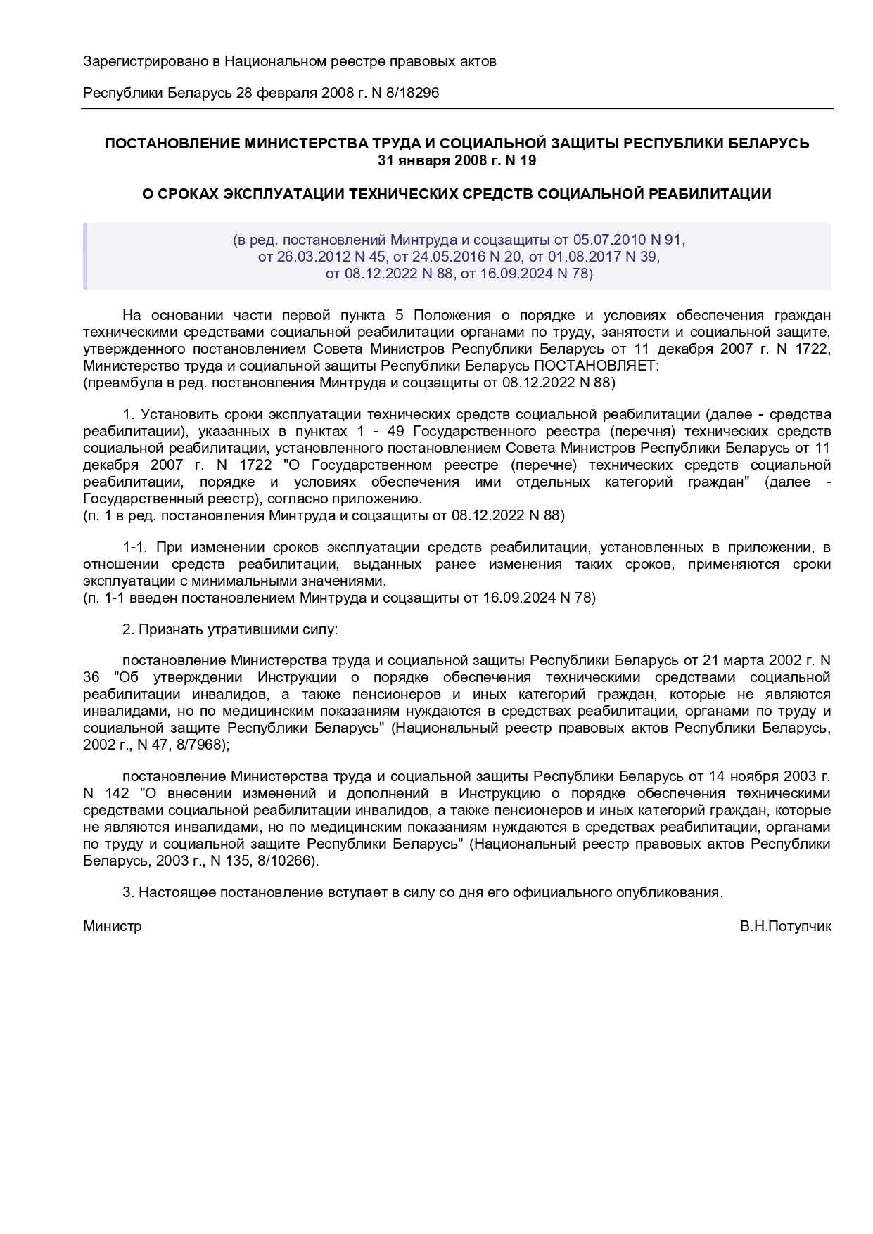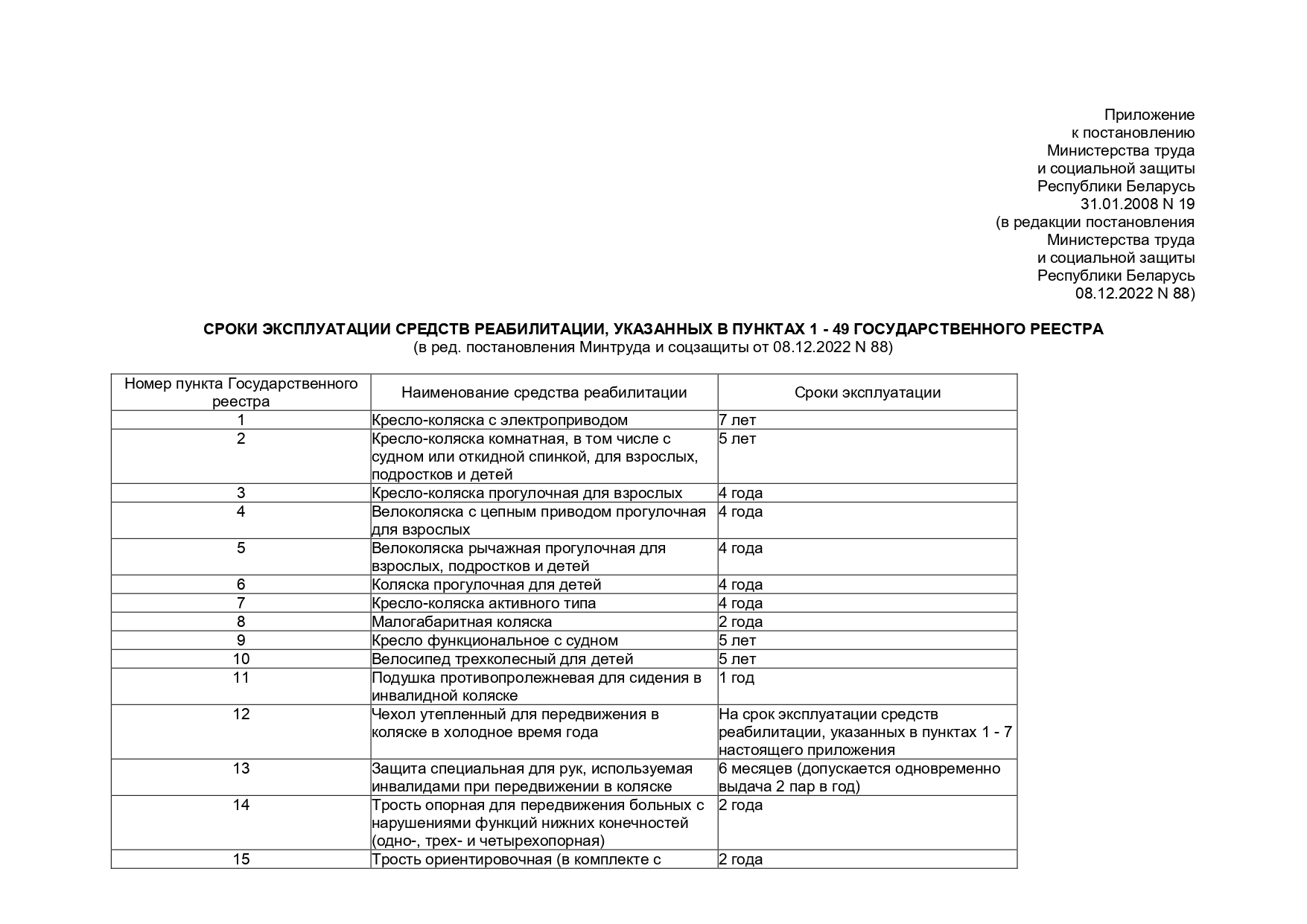 Постановление Министерства труда и социальной защиты Республики Беларусь 31 января 2008г. №19 "О сроках эксплуатации технических средств социальной реабилитации"