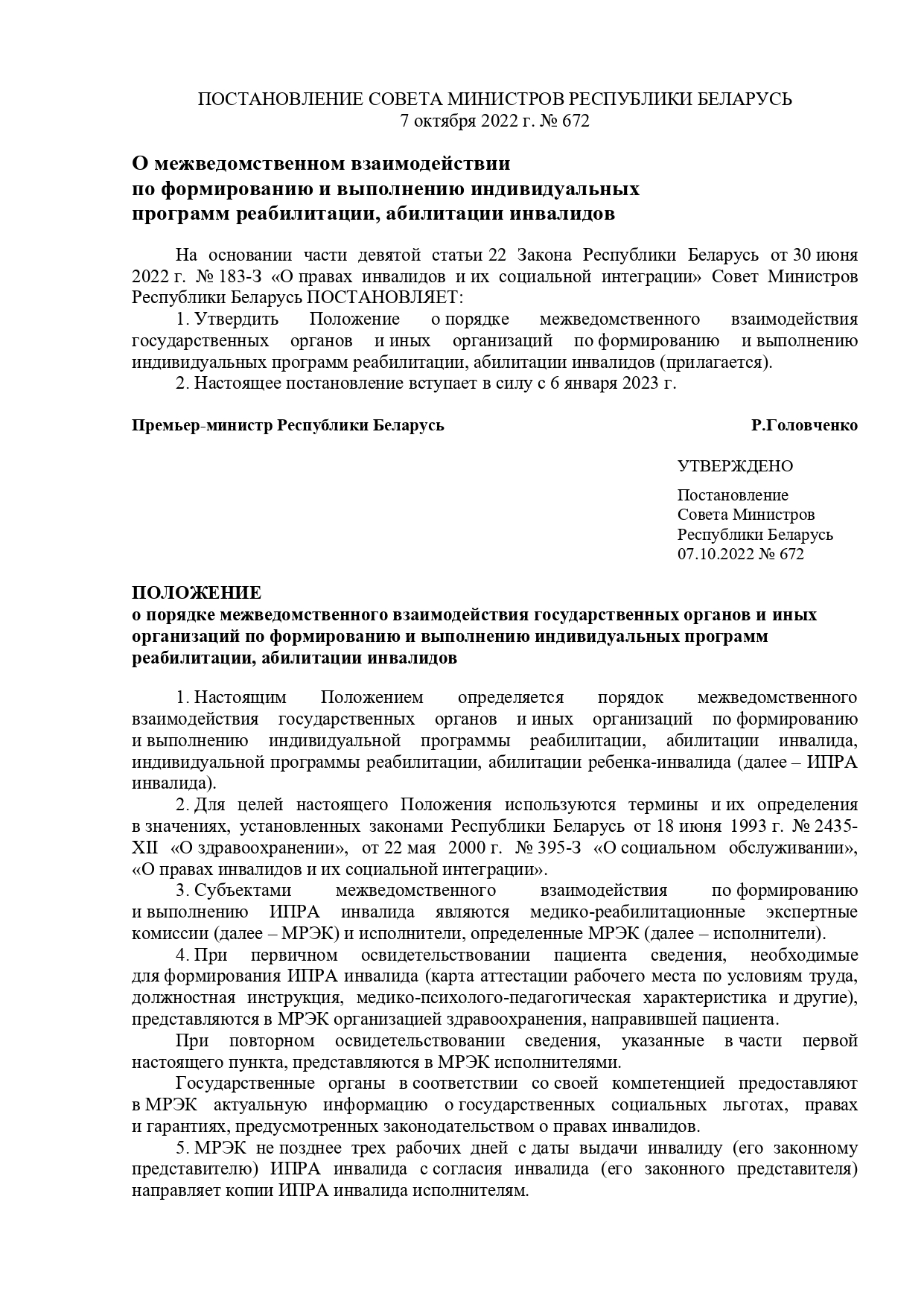 Постановление Совета Министров Республики Беларусь 7 октября 2022г. №672 "О межведомственном взаимодействии по формированию и выполнению индивидуальных программ реабилитации, абилитации инвалидов"
