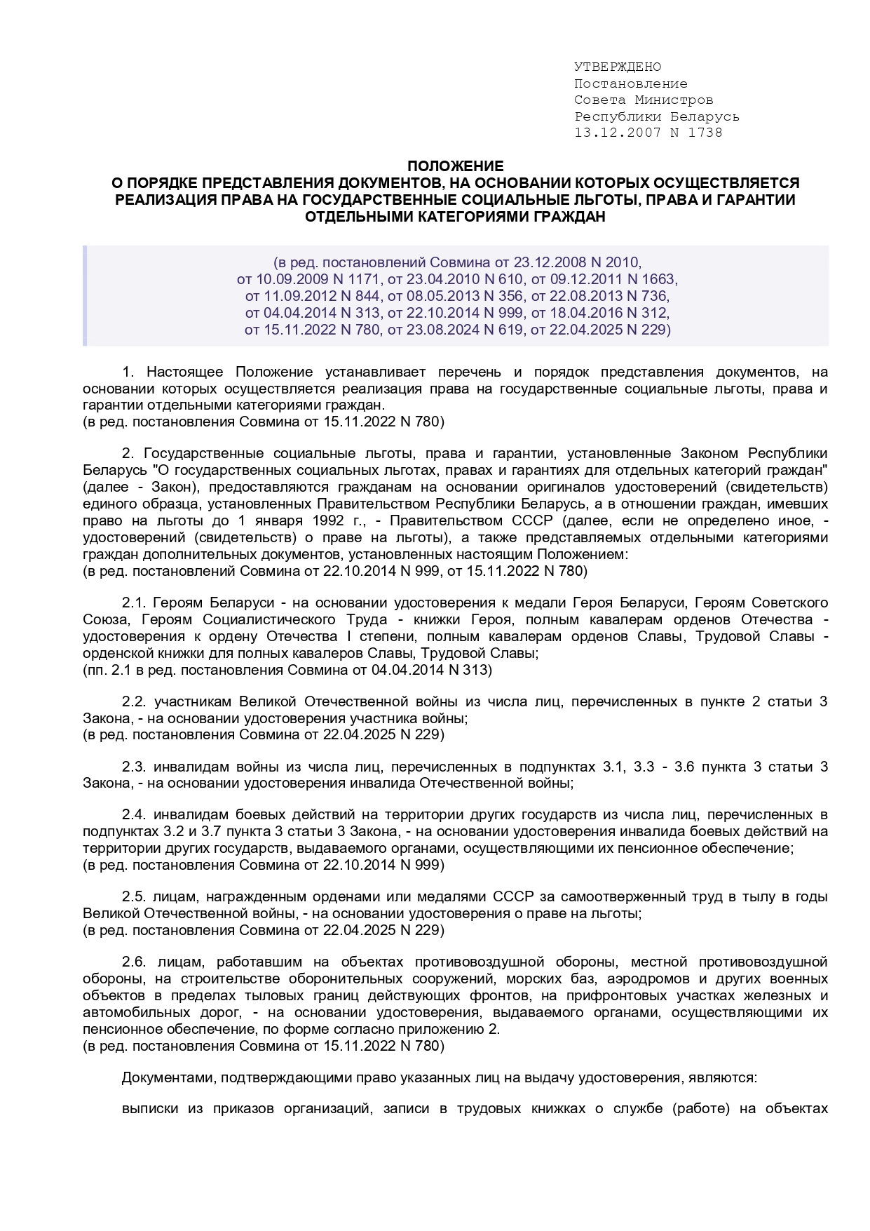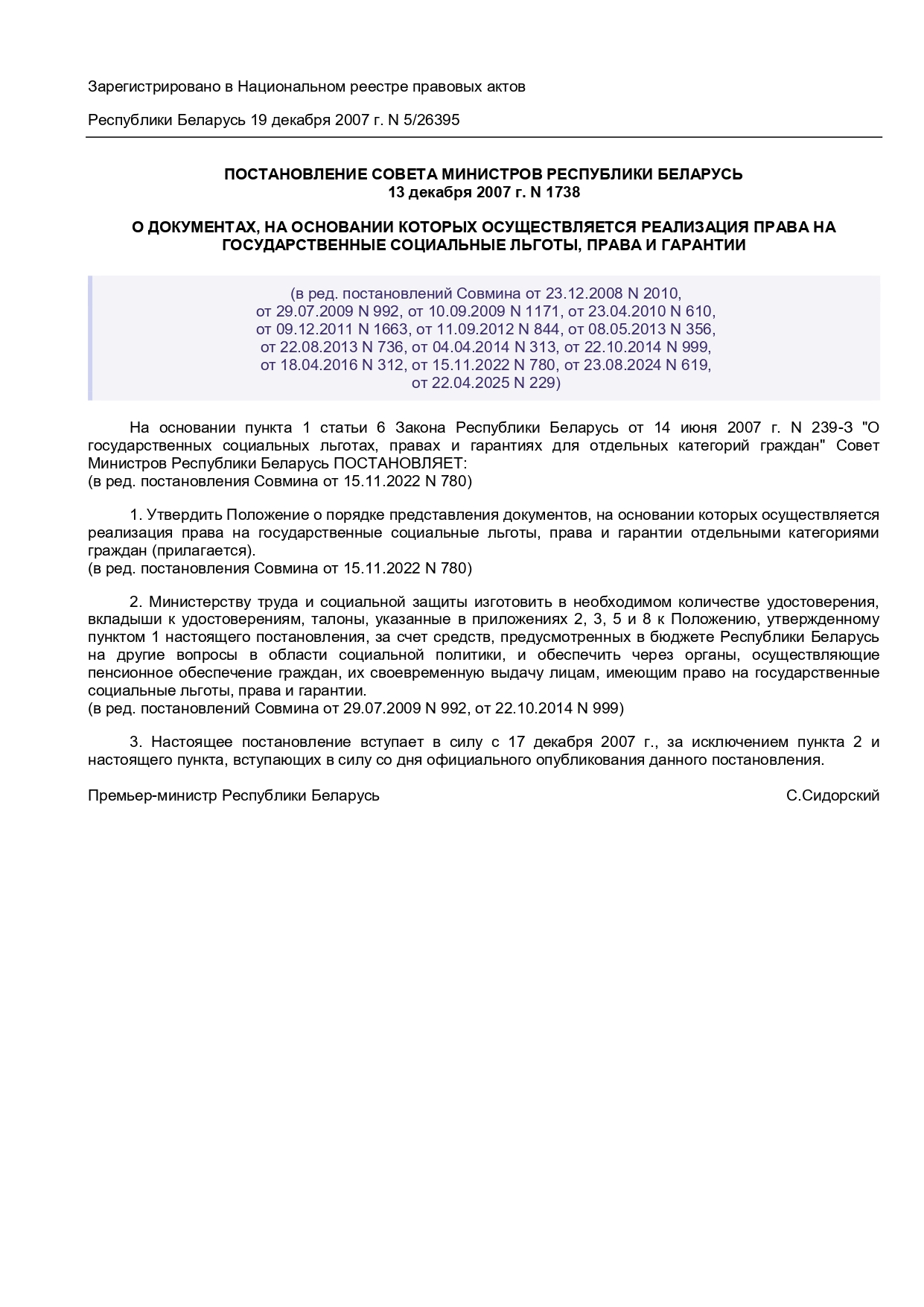 Постановление Совета Министров Республики Беларусь от 13 декабря 2007г. №1738 "О документах, на основании которых осуществляется реализация права на государственные льготы, права и гарантии